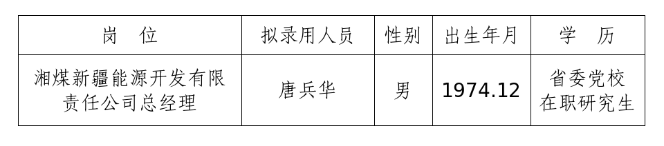 根据《壹号娱乐集团全资子公司湘煤新疆能源开发有限责任公司总经理公开招聘公告》,经报名、资格审查、面试、背景考察、体检、集体研究决策等程序,确定唐兵华同志为拟录用人员,现予以公示。