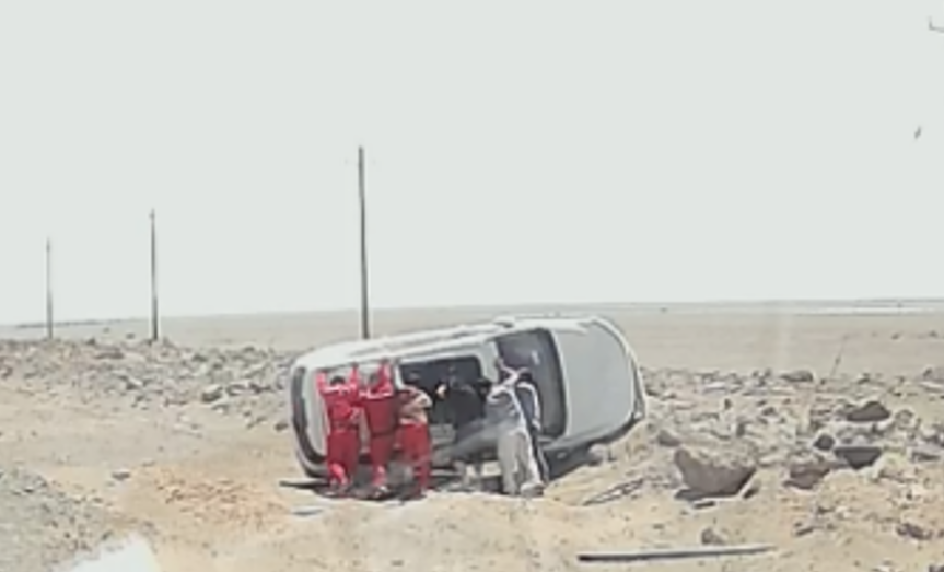 当天13时15分,在沙尔湖运煤专线(湘煤新疆能源开发公司临时指挥所1公里处),一辆白色SUV行驶途中,因车辆爆胎发生侧翻,车辆油箱破裂,汽油喷涌而出。车内有一对夫妻乘客,其中女乘客被困车内无法脱身。时值正午,烈日炙烤下的戈壁滩,地表温度高达70度,事故车辆随时有燃烧爆炸的危险。