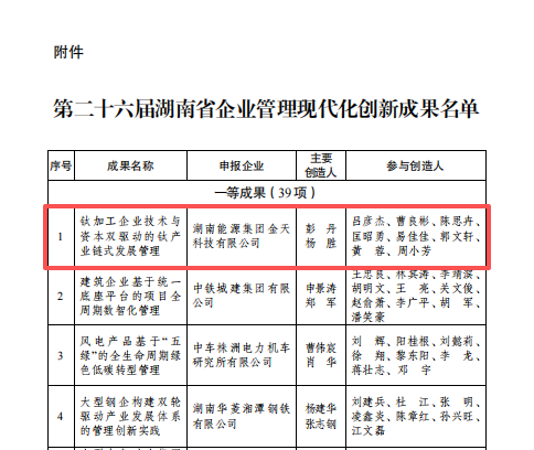 近日,在省工信厅、省国资委指导下,湖南省企业管理现代化创新成果审定委员会审定并公布了第二十六届湖南省企业管理现代化创新成果评审获奖名单,壹号娱乐集团金天科技有限公司(以下简称“金天科技”)“钛加工企业技术与资本双驱动的钛产业链式发展管理”荣获一等奖。