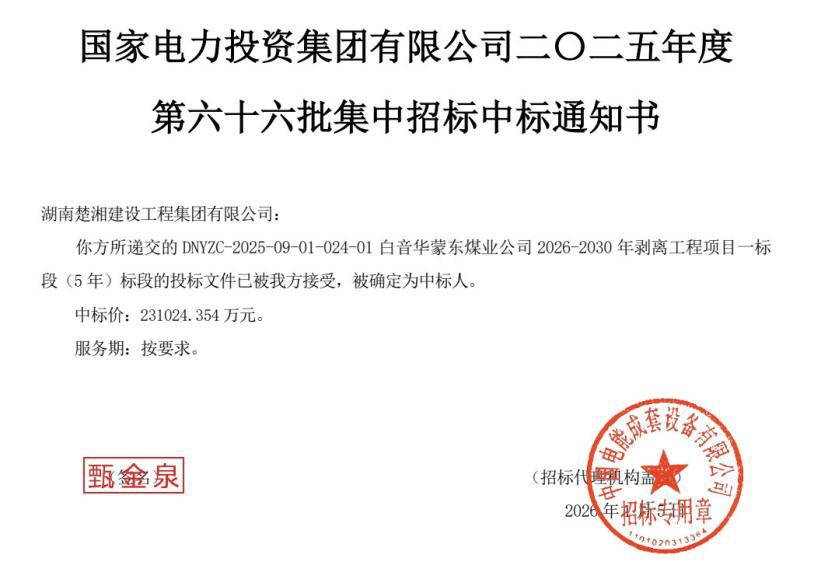 近日,壹号娱乐集团所属湖南楚湘建设工程集团有限公司(以下简称“楚湘建工”)成功中标国家电投内蒙古白音华蒙东煤业公司2026—2030年剥离工程项目一标段,拿下为期5年、中标价高达23.10亿元的重磅合同,在能源建设领域的市场竞争力再攀新高,实现了从“有力竞争者”到“首选合作者”的蜕变。